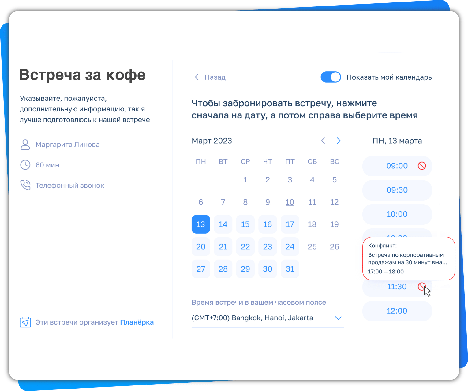 Я человек, который любит, чтобы были порядок и минимальное количество телодвижений. Изначально я пользовалась другим сервисом, но у него есть критичные для меня недочеты — интерфейс на английском. Когда я узнала про ваш планировщик, то сразу установила его, но пользоваться начала через какое-то время — боялась, что настройка займет много времени, что надо сесть, разобраться, подключить, настроить интеграции. А в итоге у меня это заняло минут 10 на все календари. Удобно, что назначать встречи можно из Телеграма, а главное — есть русскоязычный интерфейс, который понятен всем моим клиентам.